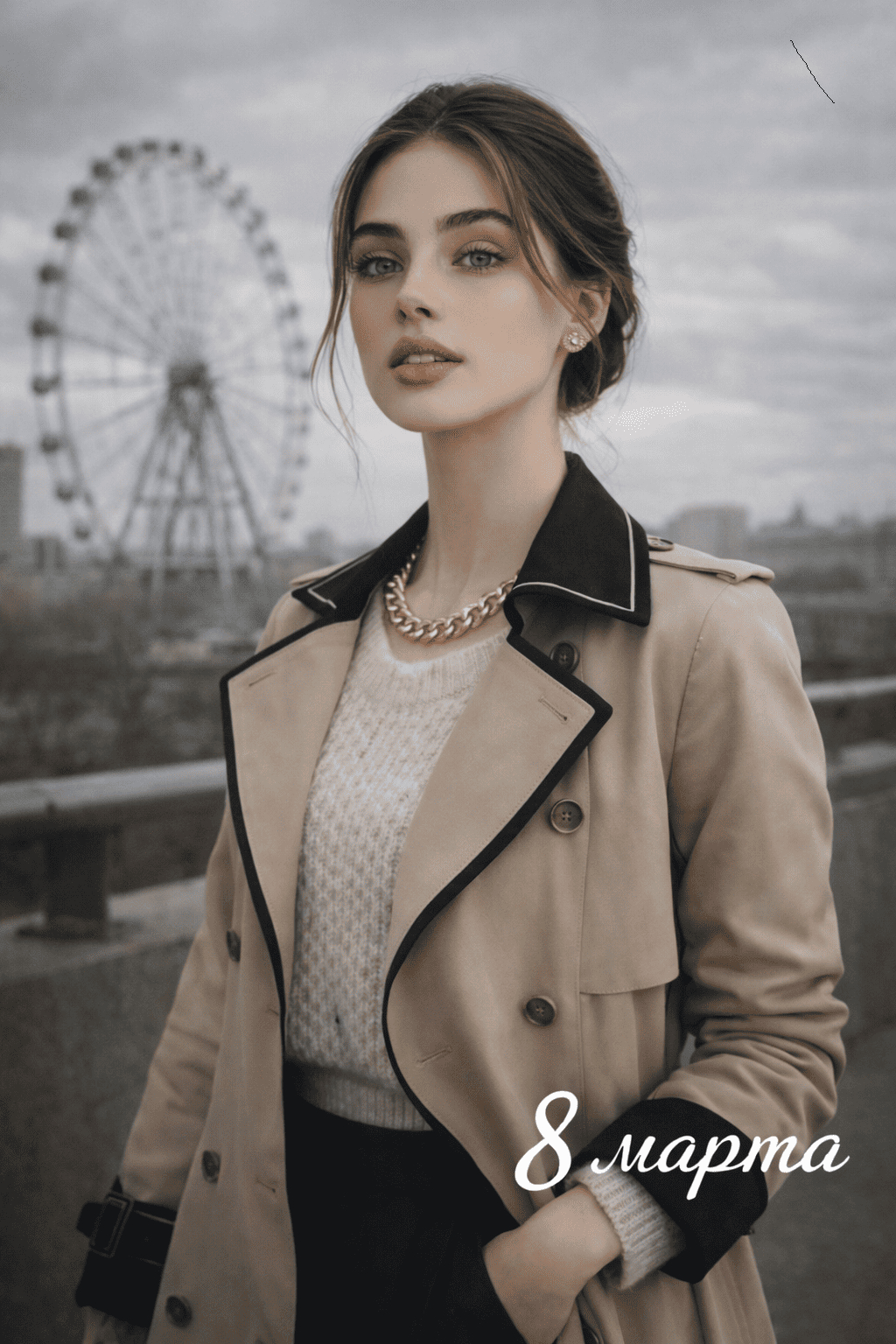 «Создай реалистичную фотографию стильной женщины на фоне урбанистического пейзажа. Возьми за основу лицо девушки, изображенной на загруженном снимке. Ее образ продуман до мелочей: светлый свитер с фактурной вязкой и стильный бежевый плащ-тренч с контрастной темной отделкой по краям рукавов и воротнику. Поза спокойная и уверенная: корпус слегка развернут, голова чуть приподнята, взгляд направлен вперед. Фон — фрагмент городского пространства: на фоне пасмурного неба выделяется металлическая конструкция, напоминающая колесо обозрения. Освещение дневное, мягкое, рассеянное. Цветовая гамма — бежевые, серые, светло-русые и черные тона. Стиль — современный городской шик: модный, элегантный, но без излишеств, высокая детализация тканей и кожи»