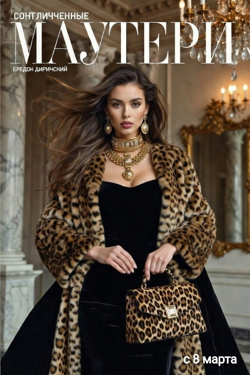 «Создай портрет женщины из фотосессии для обложки журнала о жизни богатых людей. Возьми за основу лицо девушки, изображенной на загруженном снимке. На ней — роскошная шуба с леопардовым принтом небрежно накинута на плечи поверх элегантного черного бархатного платья. Ее волосы свободно струятся. В руке — стильная сумка с леопардовым принтом. Массивное золотое ожерелье и серьги добавляют образу благородства и статуса. Фон — величественный зал в классическом стиле: мраморные колонны, хрустальная люстра, антикварное зеркало в золоченой раме. Теплый мягкий свет. Цветовая гамма — глубокий черный, теплые тона леопардового принта, благородный золотой и кремовые оттенки интерьера. Стиль — фотореализм, максимальная детализация: отдельные ворсинки меха, фактура бархата, блеск золота»