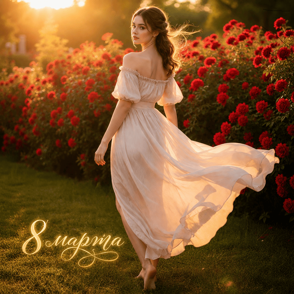 «Создай фотографию женщины в стиле «романтическая мечта». Возьми за основу лицо девушки, изображенной на загруженном снимке. Она стоит спиной к камере в легком воздушном светлом платье с открытыми плечами. Ветер подхватывает ткань и она красиво развевается. Поза естественная, расслабленная: одна нога чуть выставлена вперед, руки свободно опущены. На заднем плане пышные ярко-красные розы. Освещение — естественное, дневное, с рассеянным светом, легкие блики на ткани платья, мягкие тени. Солнечный свет мягкий, золотистый, создает теплое сияние вокруг фигуры. Цветовая гамма — теплая, золотистая, пастельная; контраст светлого платья и красных роз на кустах. Стиль — элегантный, природный, мечтательный, высокая детализация тканей и окружающей природы»