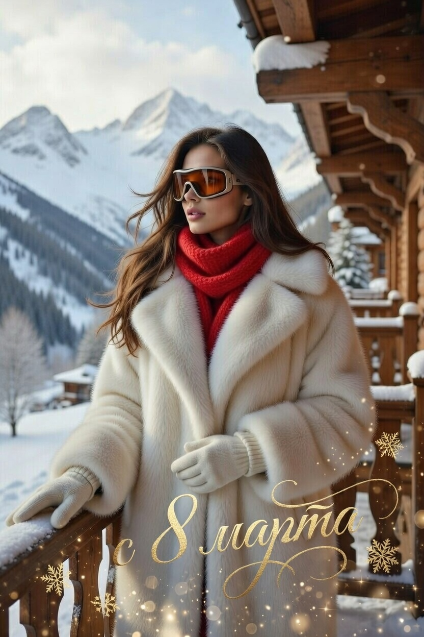 «Создай фотографию женщины в атмосфере зимнего курорта в момент наслаждения морозным днем. Возьми за основу лицо девушки, изображенной на загруженном снимке. Она одета в объемное белое меховое пальто, на шее — яркий красный вязаный шарф с фактурным узором. Кремовые перчатки гармонично дополняют ансамбль. Из аксессуаров — стильные лыжные очки с оранжевыми линзами — они придают образу спортивный шик. Волосы свободно распущены, ветер слегка шевелит пряди, добавляя динамики. Женщина стоит, слегка повернувшись в профиль, взгляд направлен вдаль, на горные вершины. Одна рука слегка опирается на перила деревянного балкона. Фон — заснеженный горный пейзаж и уютный деревянный балкон с резными перилами. Снег лежит пушистыми шапками на деревянных балках. Естественный мягкий дневной свет, рассеянный сквозь легкие облака. Цветовая гамма — сочетание белого, кремового и красного с холодными оттенками гор. Оранжевые линзы очков добавляют теплый акцент. Стиль — фотореализм, акцент на игре света и тени, деталях зимнего пейзажа и фактурах одежды»