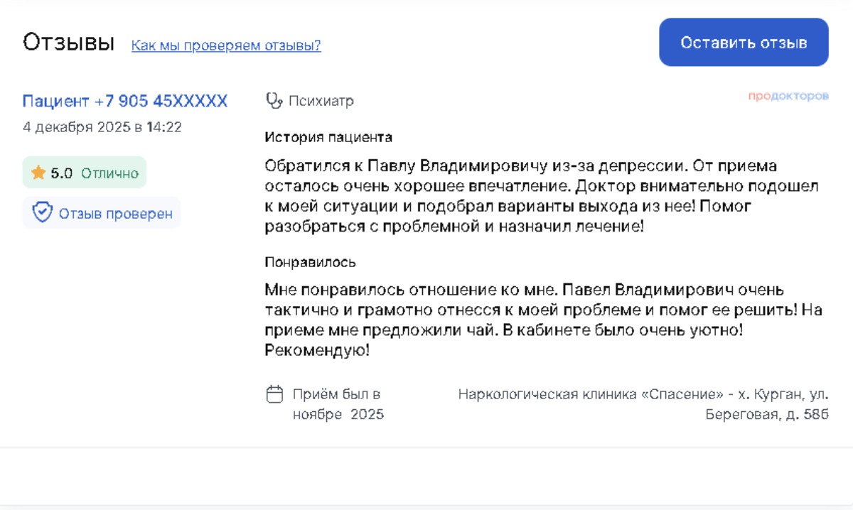 Именно поэтому в «Спасение» с пациентом работает не один врач, а команда специалистов. Родственники часто подчеркивают это в отзывах: лечение не выглядит шаблонным, с семьей разговаривают, а проблему пытаются понять вглубь, а не просто убрать внешние проявления.