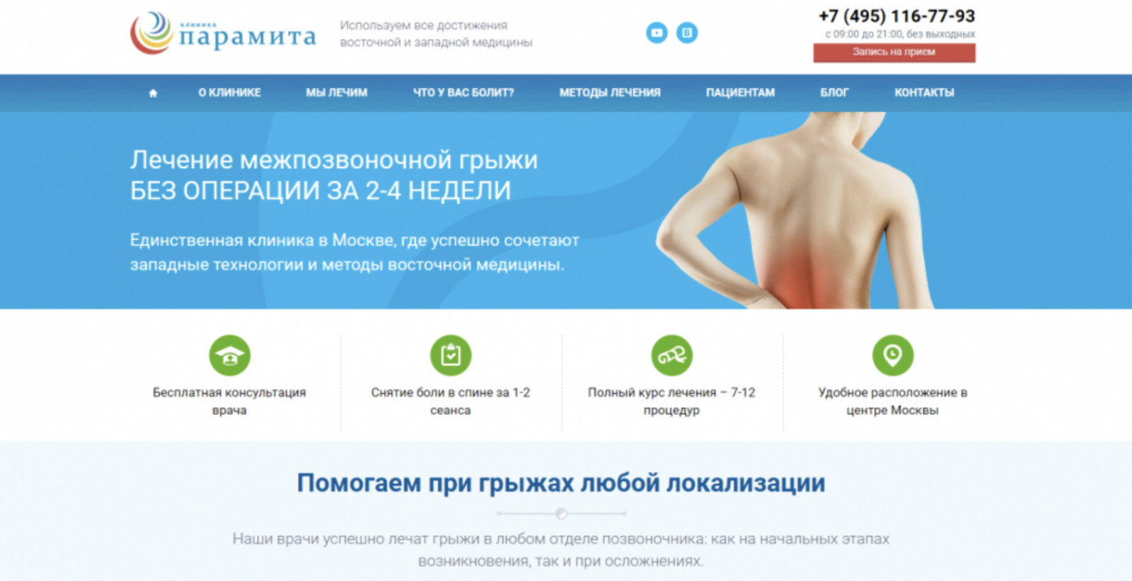 Конверсионные страницы мы сделали в формате посадочных — отдельно под разные заболевания и методы лечения.