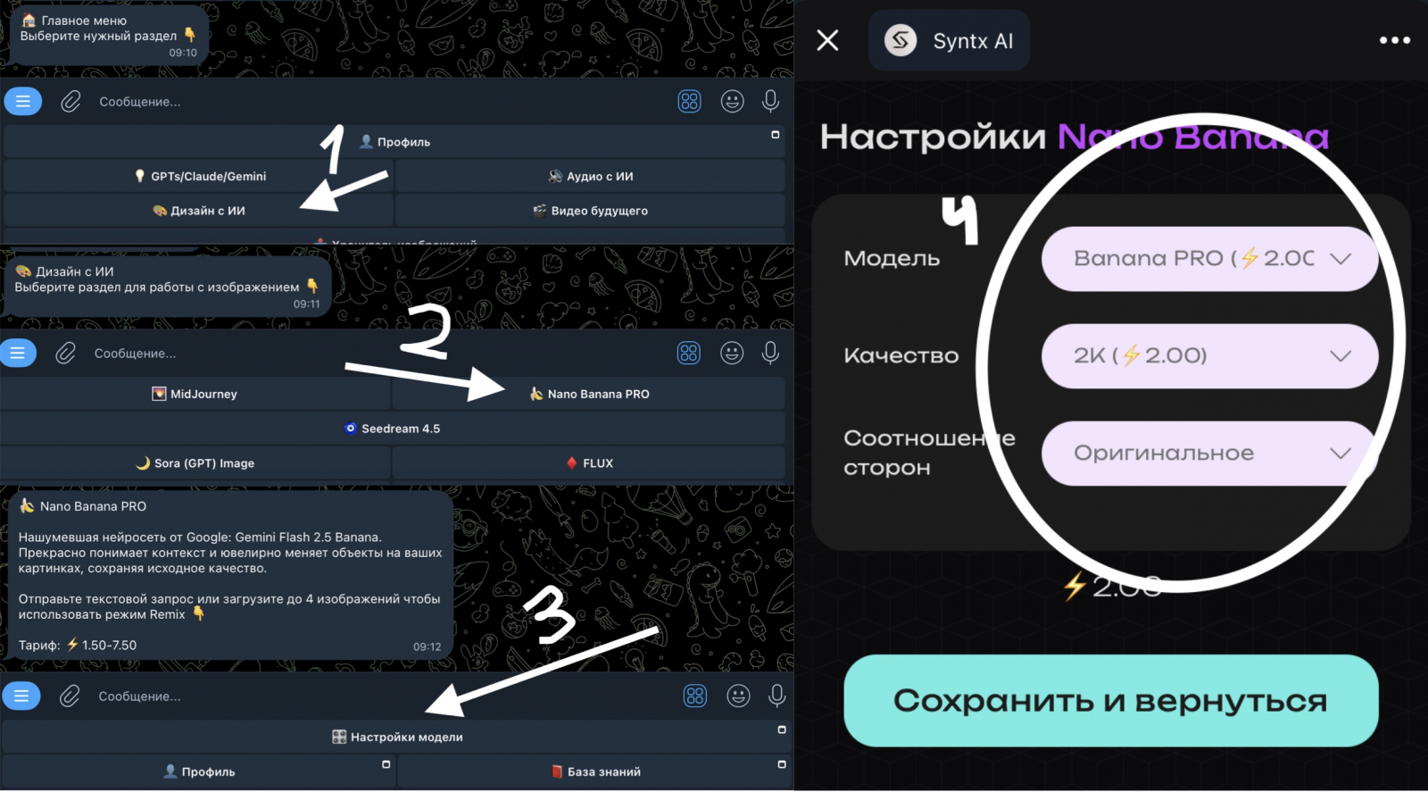 Итак, я захожу в Syntx Ai, выбираю Дизайн с ИИ и жму на Nano Banana. Там я в настройках модели обязательно указываю Pro версию и размер "Оригинальный".