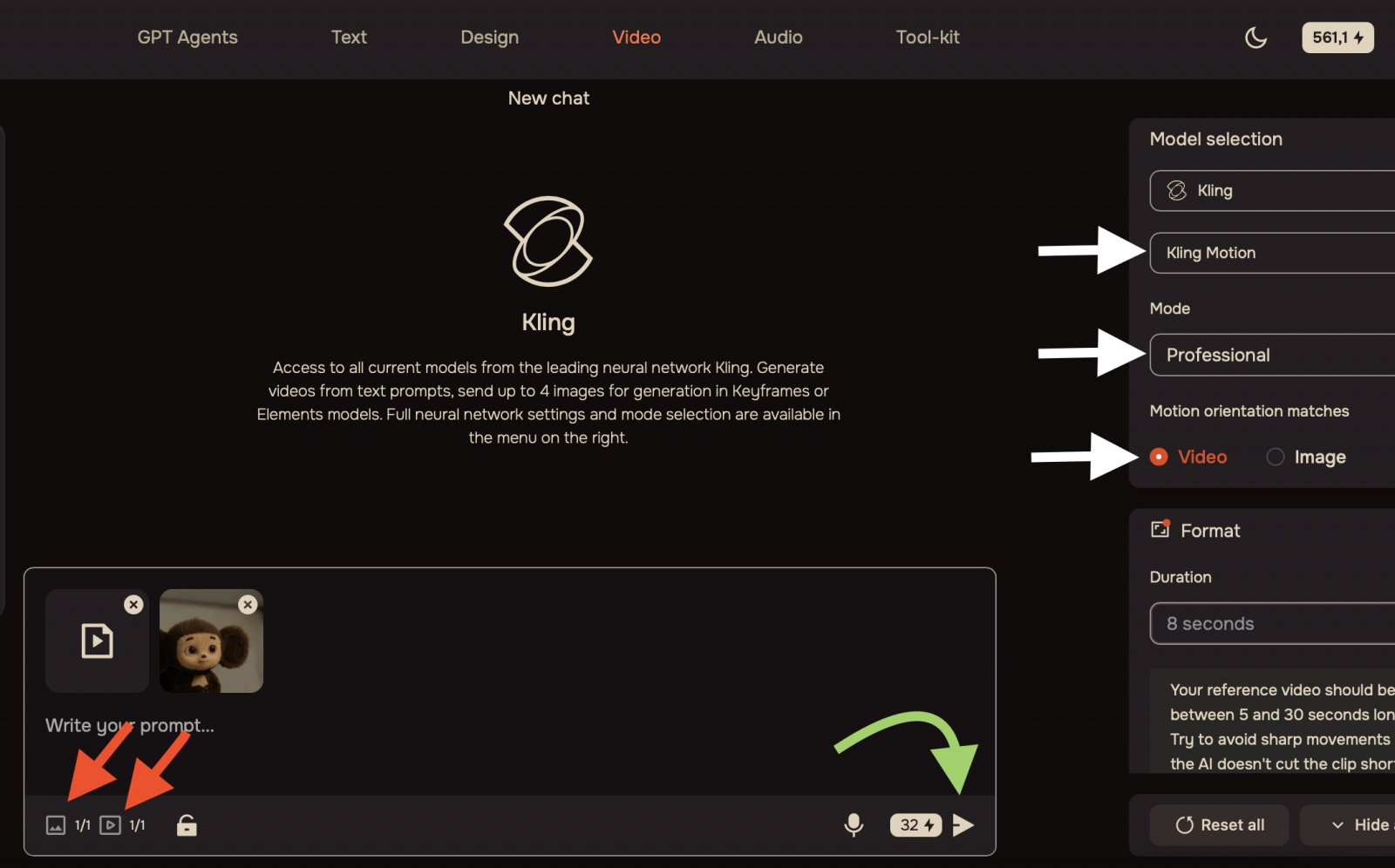 Теперь переходит на веб-версию сервиса Syntx Ai (мне там удобнее генерировать видео, чем в ТГ-боте) и выбираем Видео > Kling > Kling Motion. В видео я вставляю тот кусочек видео, в котором мне нужно заменить персонажа, а в фото - то, что я сделал в Nano Banana Pro. Начинаем генерацию!
