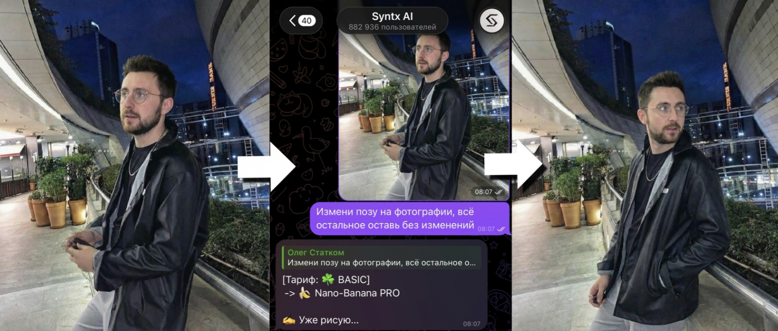 Я снова отправляю в бот SyntxAi фотографию, но уже ту, которую мне сгенерировал только что Nano Banana Pro и даю ему команду, что я хочу изменить в своём нейрофото.