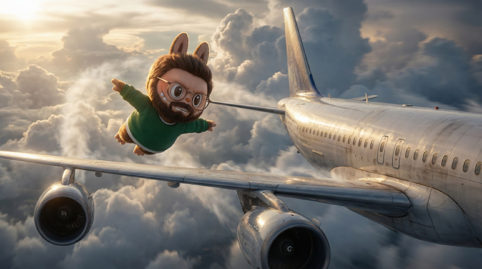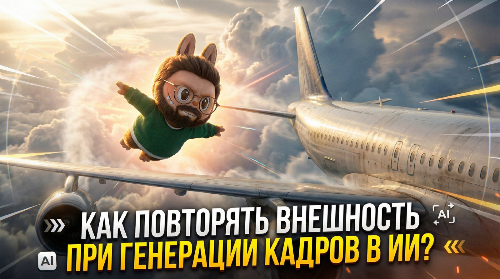 Я скачиваю это изображение, отправляю в SyntxAi Nano Banana Pro и теперь продумываю нужную мне сцену. Например, как мой персонаж летит среди облаков, как супермен, рядом с самолётом. Обязательно упоминаю, чтобы он полностью повторил внешность, как в референсе фото 1 (то, что мы прикрепили).