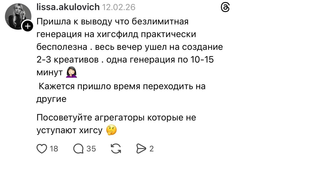 1. Самая главная проблема - команда Higgsfield не вывозят ту планку, которую они сами себе задрали. Да, у них много инструментов, нейросетей, готовых шаблонов и связок. Это значительно помогает ускорить работу профессиональному ИИ креатору... только если бы всё работало стабильно, без долгих генераций в нейросетях по 1-2 часа.