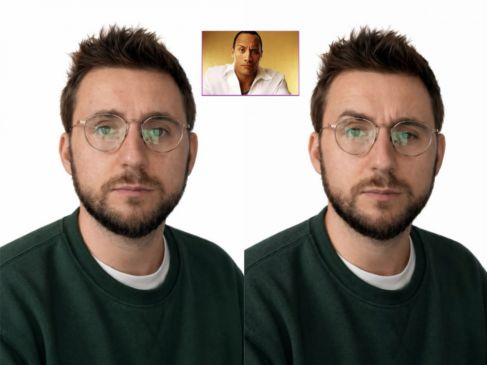 Ещё интереснее — замена внешности на фото. Берём кадр с одним человеком, прикрепляем фото другого, и GPT Image 2 делает замену, сохраняя позу, освещение и контекст сцены. Nano Banana Pro внешность сохраняет заметно хуже — лицо часто «уплывает», становится похожим, но не узнаваемым.