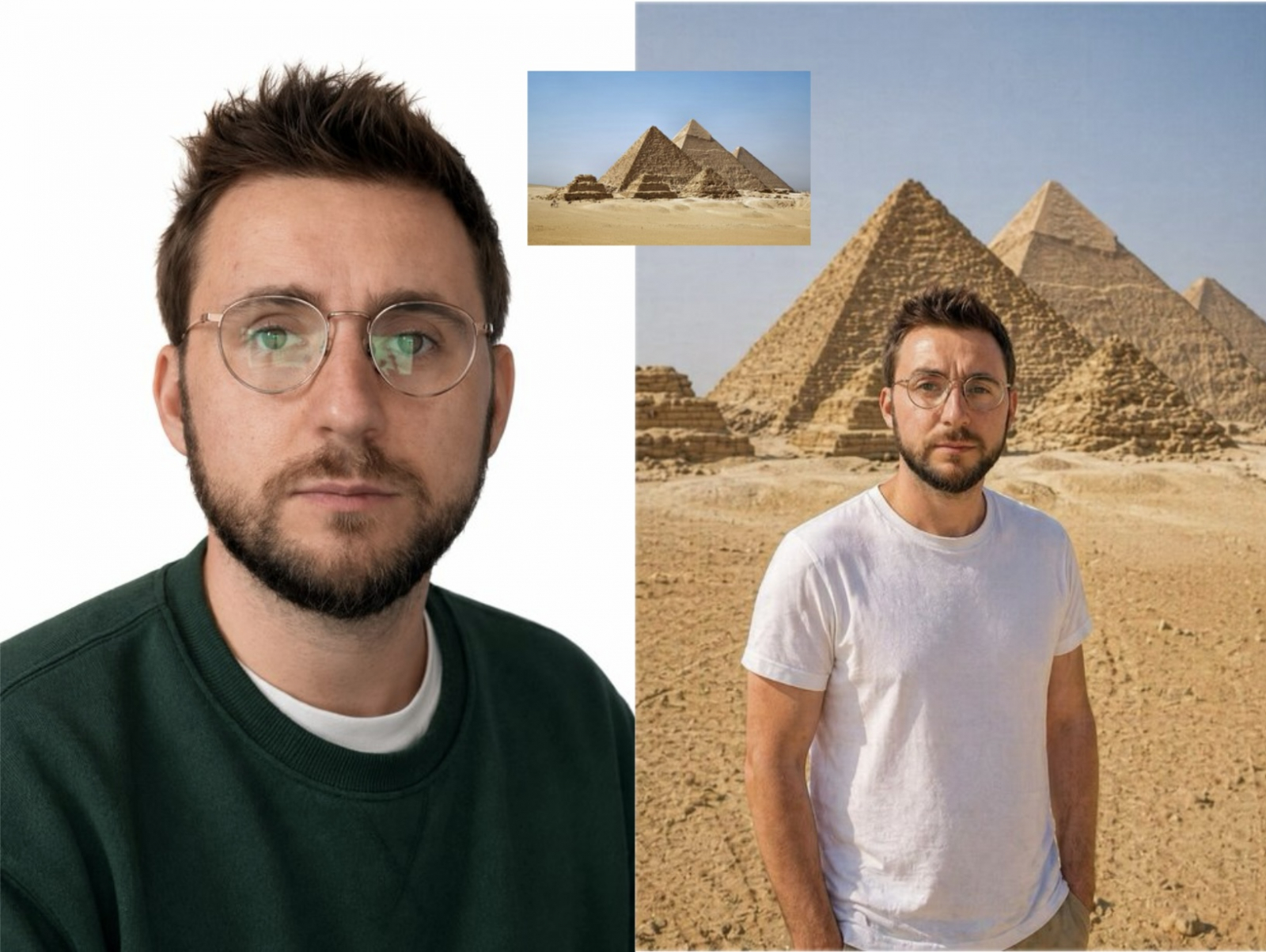 Замена фона на конкретный — ещё одна показательная задача. Нужно поместить человека в новую локацию так, чтобы выглядело как реальная фотография. GPT Image 2 справляется убедительно — освещение подстраивается, тени ложатся естественно. Nano Banana Pro требует длинного, детально прописанного промпта, чтобы результат выглядел нормально. Без этого — заметная «склейка».