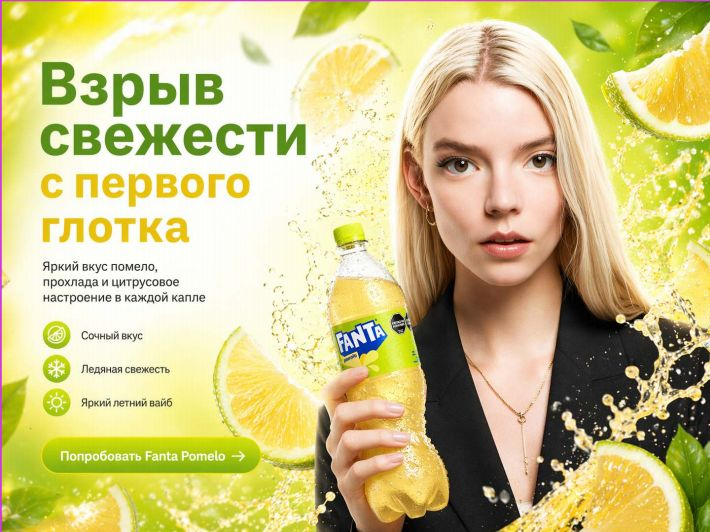 GPT Image 2. Она лучше держит внешность персонажей, точнее рендерит текст и позволяет итерировать баннеры прямо в чате — «сделай бутылку меньше», «измени фон»