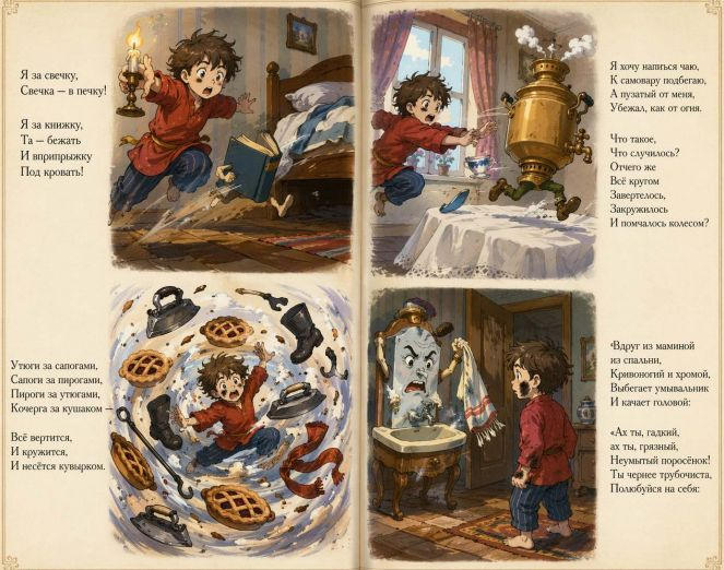 GPT Image 2 уверенно рендерит текст — и это касается не только простых надписей. Модель копирует стиль текста с референса: текст по кругу, граффити на арабском, кириллица. Разворот детской книги с текстом из «Мойдодыра» — весь текст сохранился идеально, иллюстрации в заданном стиле аниме.