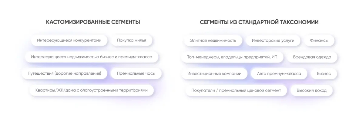 В Segments же собрали пользователей, интересующихся конкурентами, планирующих покупку жилья, а также интересующихся недвижимостью бизнес- и премиум-класса, квартирами/ЖК/домами с благоустроенными территориями, дорогими путешествиями и премиальными часами.