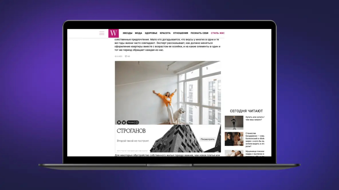 Креативы были органично интегрированы в фотоиллюстрации к статьям. Это помогло выделяться без давления и размещаться в фокусных плейсментах в центре экрана, что важно для премиального сегмента.
