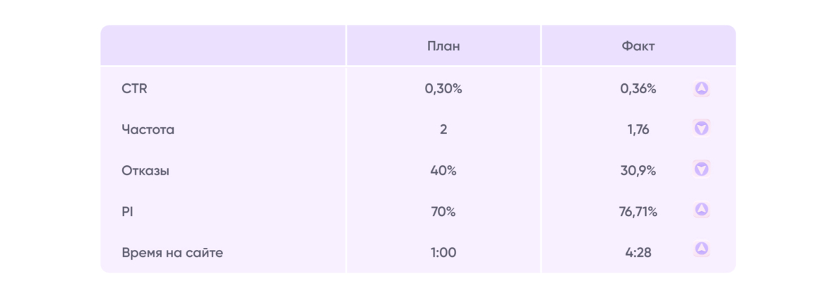 Там, где по KPI были заданы плановые и фактические значения, все целевые показатели либо достигнуты, либо превышены, а по остальным метрикам кампания обеспечила устойчивый поток заинтересованных пользователей.
