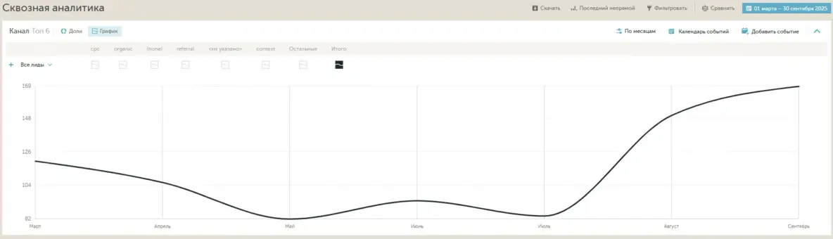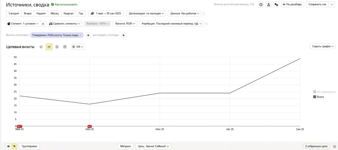 По итогам конверсий в Calltouch зафиксировано 4 звонка и заявки, 2 сделки, 2 уникально-целевых лида, 2 уникальных лида, 4 целевых лида. C подключением VOX узнаваемость бренда выросла, лиды из директа увеличились в 1,5 раза, а CPL уменьшилось на 53%.