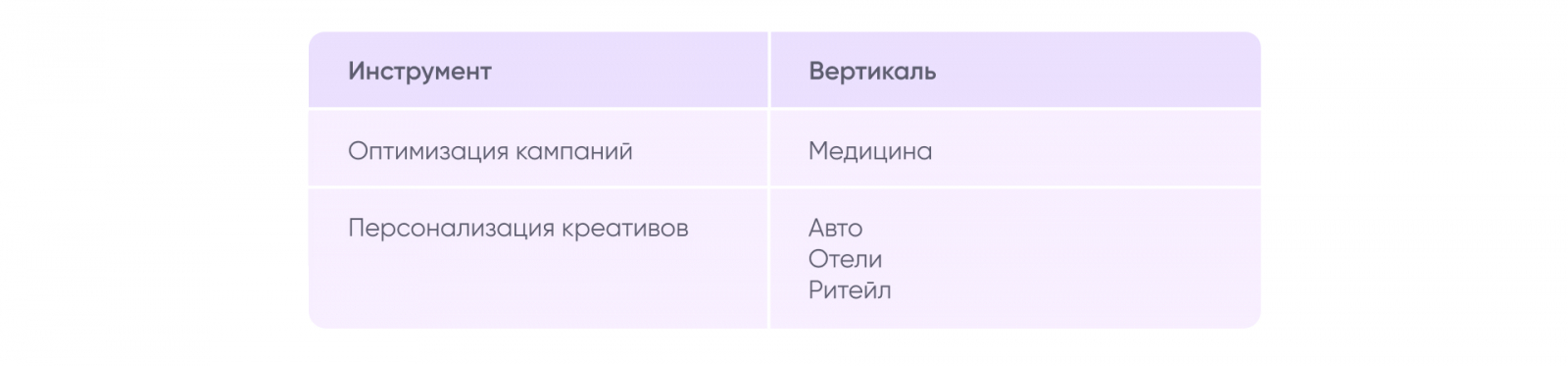 Сравнение осуществлялось в рамках A/B-теста при соблюдении единых условий. Команда оценивала показатели CTR, CPC, количество PC (post-click) и PV (post-view) конверсий, а также их стоимость. Тестировались следующие инструменты и вертикали: