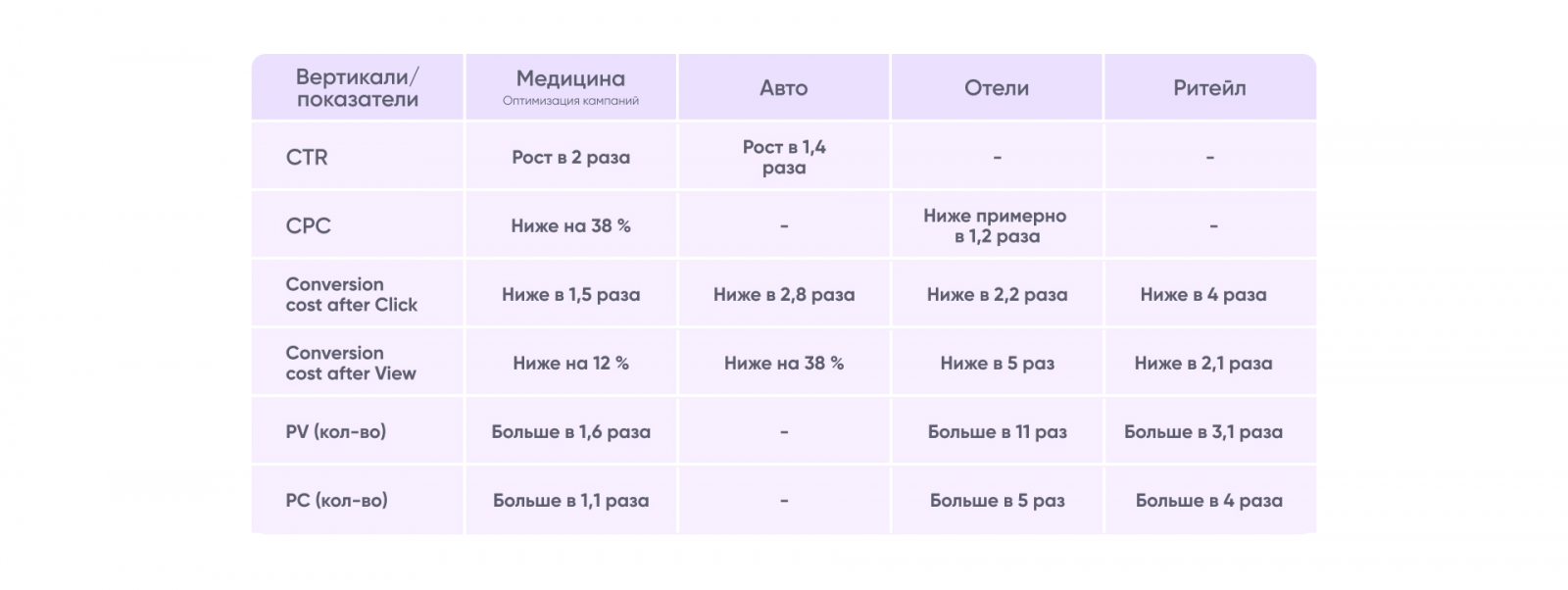 В «Медицине» CTR вырос в 2,04 раза, CPC снизилась на 38 %, стоимость PC конверсии – в 1,5 раза, PV конверсии – в 12 %.