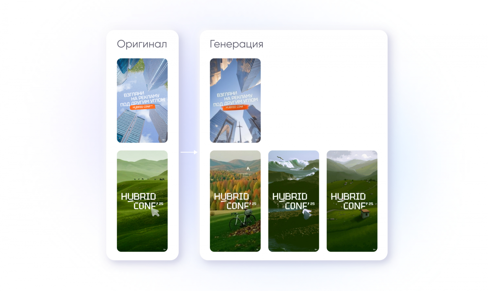 Чтобы проверить это на практике, мы тестировали решение на баннерах, которые подготовили для нашей конференции. Для генерации выбирали самый популярный баннер. Это был хороший стресс‑тест, ведь у мероприятия жестко задана айдентика, нужно было сохранить цветовую гамму, типографику и характерные графические элементы, а также не сломать стиль и атмосферу события. При этом креативы должны быть пригодны к запуску в разных форматах и выглядеть как единая серия. Делимся результатами и примерами генераций.