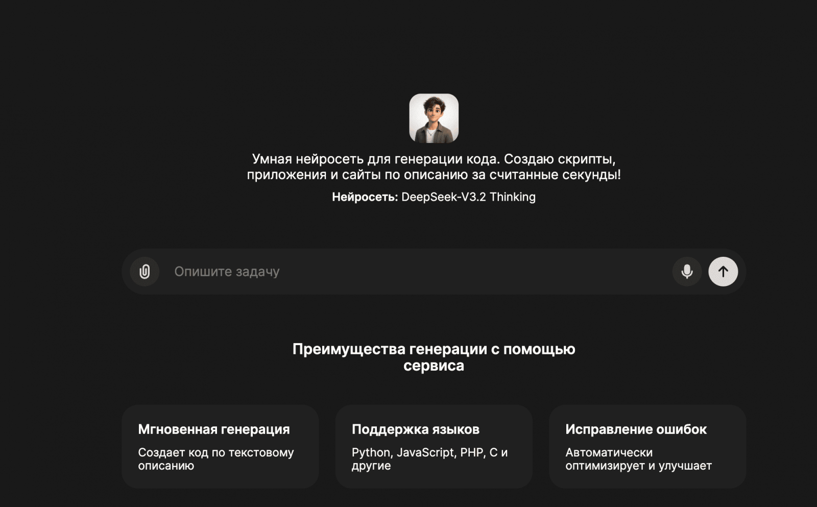 Пользователь описывает задачу на обычном языке: «Сделай Telegram-бота для приема заявок», «Создай REST API на FastAPI», «Собери лендинг с формой и валидацией». После этого модель предлагает структуру решения, стек, код файлов, команды запуска и рекомендации по доработке.