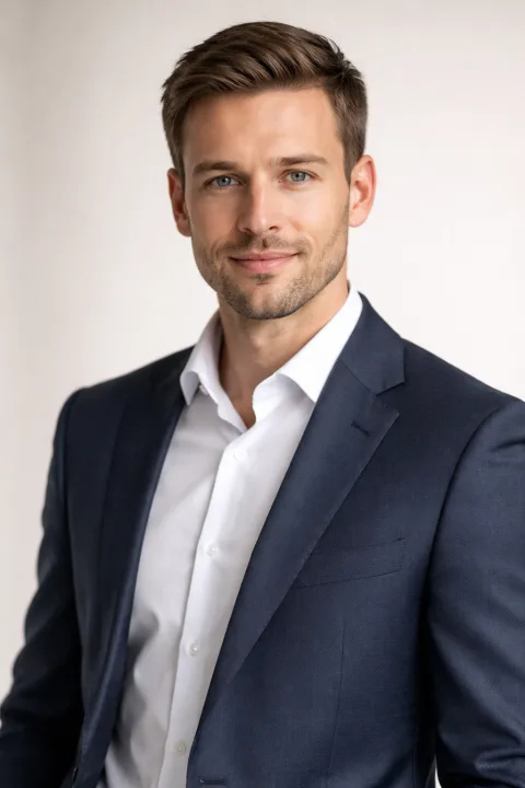 Фотореалистичный деловой портрет: человек в классическом костюме (пиджак, рубашка), аккуратная причёска, лёгкая естественная улыбка, уверенная поза, кадр по грудь, нейтральный светлый фон, мягкий студийный свет (key + fill), чистая кожа без сильной ретуши, высокая детализация, 85mm, f/2.8, реализм, 4K, без текста, без логотипов, без водяных знаков.