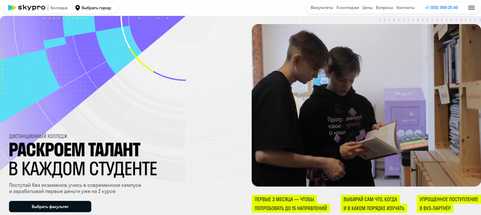 Обучение строится вокруг проектов. Студенты создают готовые продукты и защищают их как дипломные работы. Форматы — очный и онлайн. Кампусы работают по России.