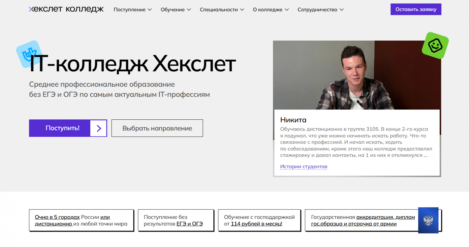 Обучение проходит очно и дистанционно после девятого и одиннадцатого класса без ОГЭ и ЕГЭ. Кампусы работают по России.
