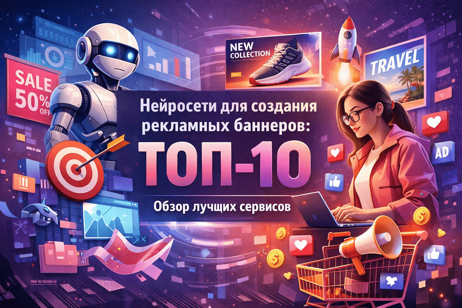 Рекламный баннер давно перестал быть просто картинкой с текстом. Сейчас это полноценный креатив, который должен быстро передавать смысл, цеплять внимание аудитории и соответствовать формату площадки. Для этого приходится делать десятки вариантов: под соцсети, лендинги, медийную рекламу, маркетплейсы, e-commerce, email-рассылки и презентации. Нейросеть помогает резко ускорить этот процесс.
