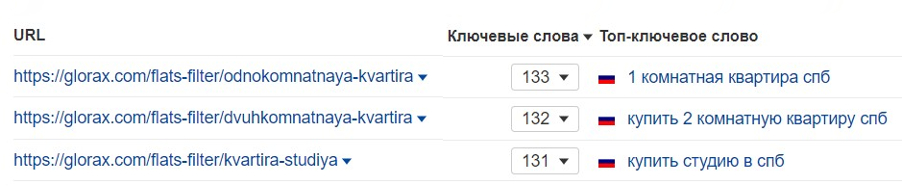 Ниша, в которой работает GloraX, чрезвычайно конкурентная. Весь ТОП в поисковых системах был занят крупными агрегаторами недвижимости: ЦИАН, Домклик, Яндекс.Недвижимость, а также крупными игроками рынка. В связи с чем, изначально мы нацелились на конкурентов, близких к нам и по типу и по размеру сайта.