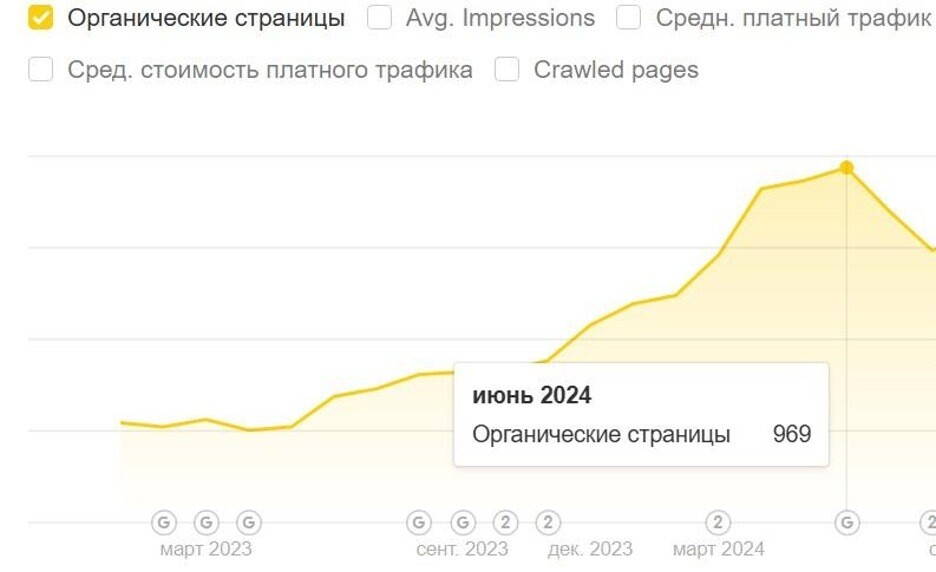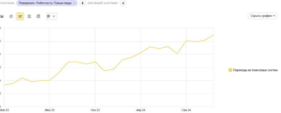 В 2023 году органический трафик сайта увеличился в 1.5 раза по сравнению с 2022 годом, за 2024 год достигли результата в 1.7 раза (в сравнении с 2023, когда уже начали проводить работы по сайту и уже получили приемлемый результат)