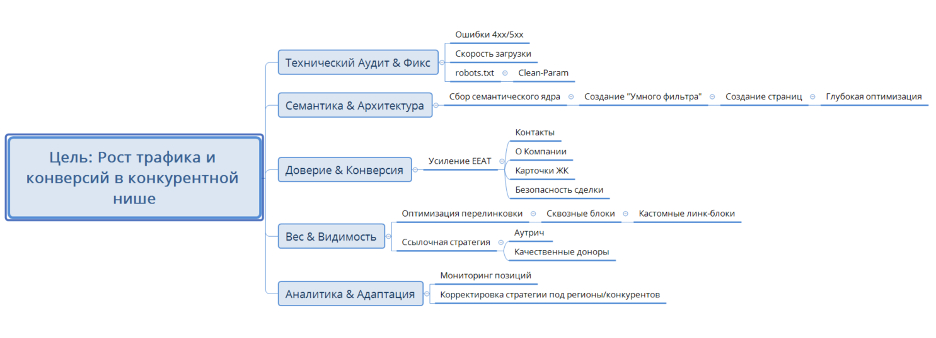 Процесс работы над проектом можно условно разделить на несколько ключевых этапов, каждый из которых сыграл свою важную роль в успешном продвижении сайта.