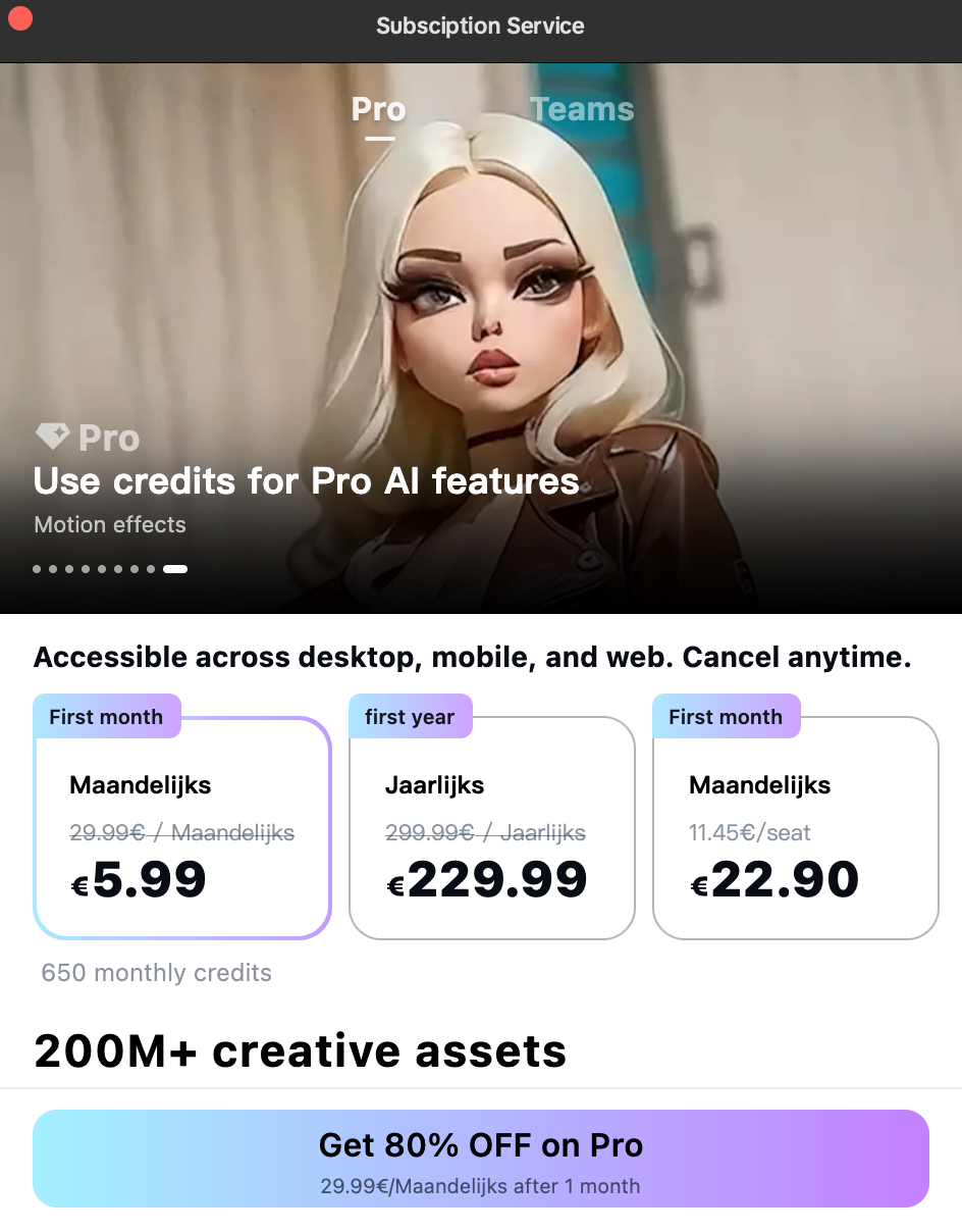 Т.е. для использования удаления шума, необходимо приобристи весь тариф видеоредактора, что не очень практично. На первый месяц есть скидка в 80%. Дойти до оплаты и понять, можно ли оплатить российской картой мне не удалось, выскакивала ошибка, но я думаю оплата только зарубежной картой.