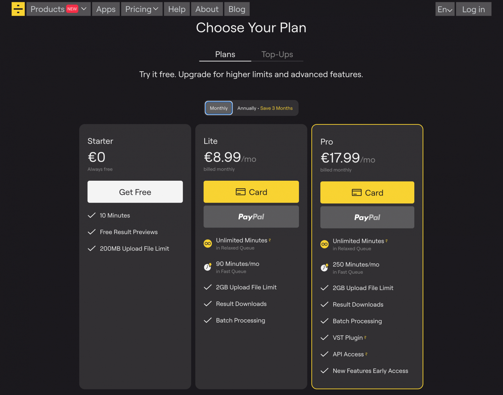 Включает в себя безлимитные минуты, с медленной обработкой и 250 мин Fast. Ограничения до 2 ГБ на файл, есть пакетная загрузка.