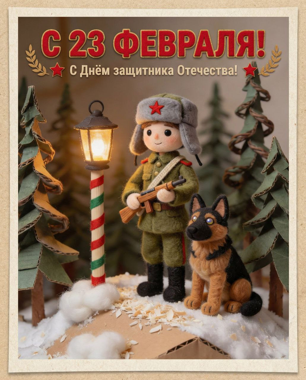 A whimsical stop-motion still. A needle-felted soldier doll in an olive-green wool uniform stands on a snowy cardboard hill. He holds a tiny wooden rifle with a felt strap. Besitzt him sits a loyal German Shepherd dog sculpted from caramel and black wool roving, with bead eyes. The soldier wears a ushanka hat made of grey felt with a red star pin. Snow is cotton batting and shredded coconut flakes. Behind him, a border pillar is made from painted dowel with red and green stripes. The forest is twisted cardboard spruce trees. Warm amber light from a miniature lantern. Tactile materials, handcrafted diorama, children's book illustration, stop-motion texture