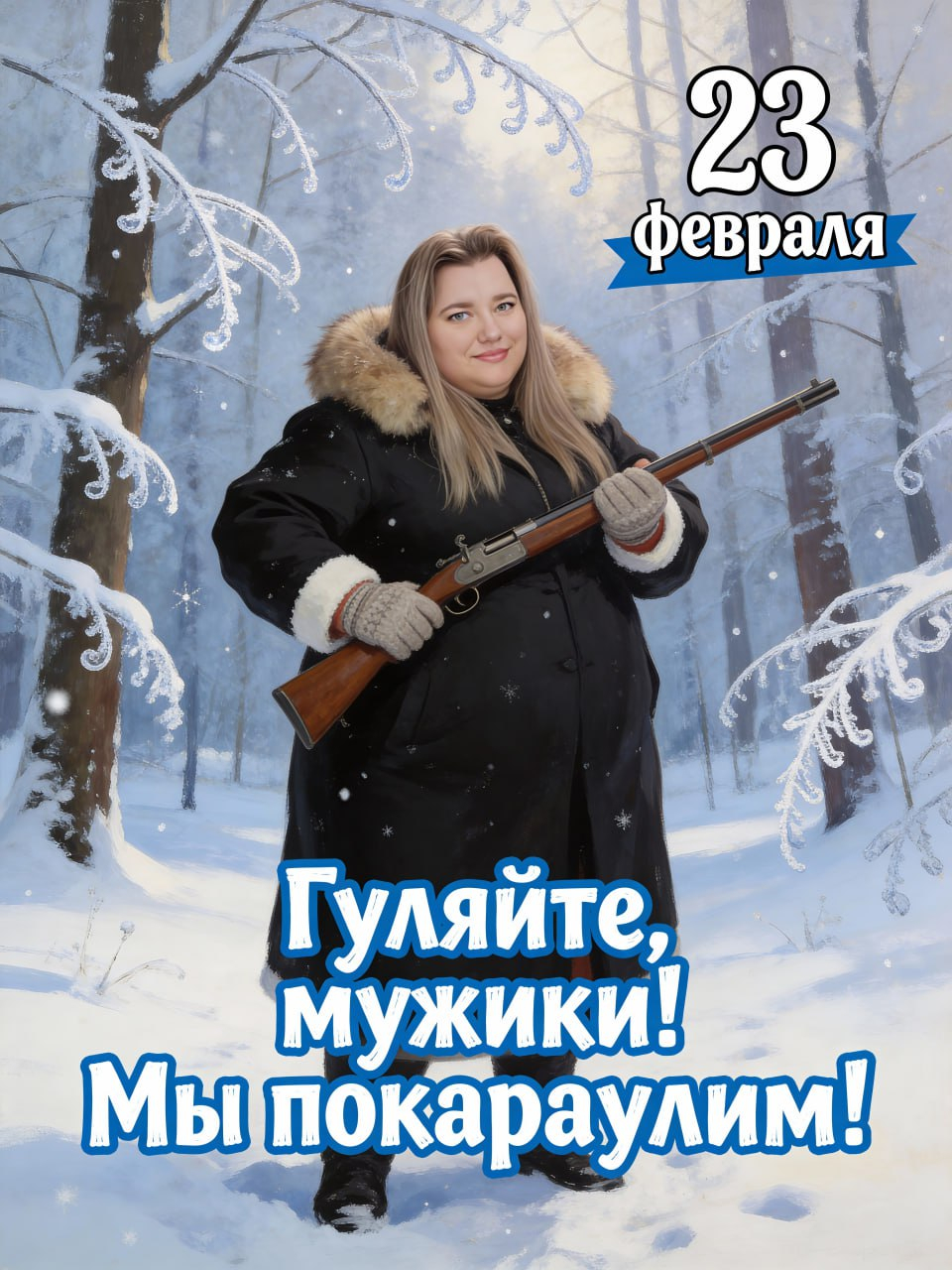 Создай юмористическую открытку к 23 февраля в стилистике классической русской зимней живописи. В центре композиции — добродушная, пышная женщина в тёплом меховом тулупе с белой опушкой и варежках. Лицо женщины воспроизводится с абсолютной точностью по референсу – структура, черты, пропорции сохранены идентично. Она стоит на заснеженной поляне среди искрящихся от инея деревьев. Женщина держит в руках охотничье ружьё, её поза уверенная, но не агрессивная, а скорее комично-героическая. На лице — лёгкая улыбка, выражающая готовность «взять на себя ответственность». Фон — заснеженный лес с причудливо изогнутыми ветвями деревьев, покрытыми инеем. Свет мягкий, с лёгким голубоватым оттенком, создающий ощущение морозного утра. Снег искрится, добавляя картине сказочности. В верхнем правом углу крупно выведи дату: «23 февраля» — шрифтом с лёгким ретро-оттенком, белым цветом с синей тенью для контраста. В нижней части открытки размещай надпись крупным, немного «шатким» шрифтом: «Гуляйте, мужики! Мы покараулим!» Цвет шрифта — синий с белой окантовкой, чтобы выделялся на фоне снега. Стиль изображения должен сочетать юмор и лёгкую иронию, быть одновременно тёплым и забавным. Цветовая гамма — преимущественно холодные оттенки (голубой, белый, серый) с акцентами тёплых тонов в одежде героини (бежевый, коричневый). Композиция должна быть сбалансированной: героиня — в центре, текст не должен «перетягивать» внимание, но быть хорошо читаемым. Общая атмосфера — добродушная, праздничная, с намёком на традиционный русский юмор.