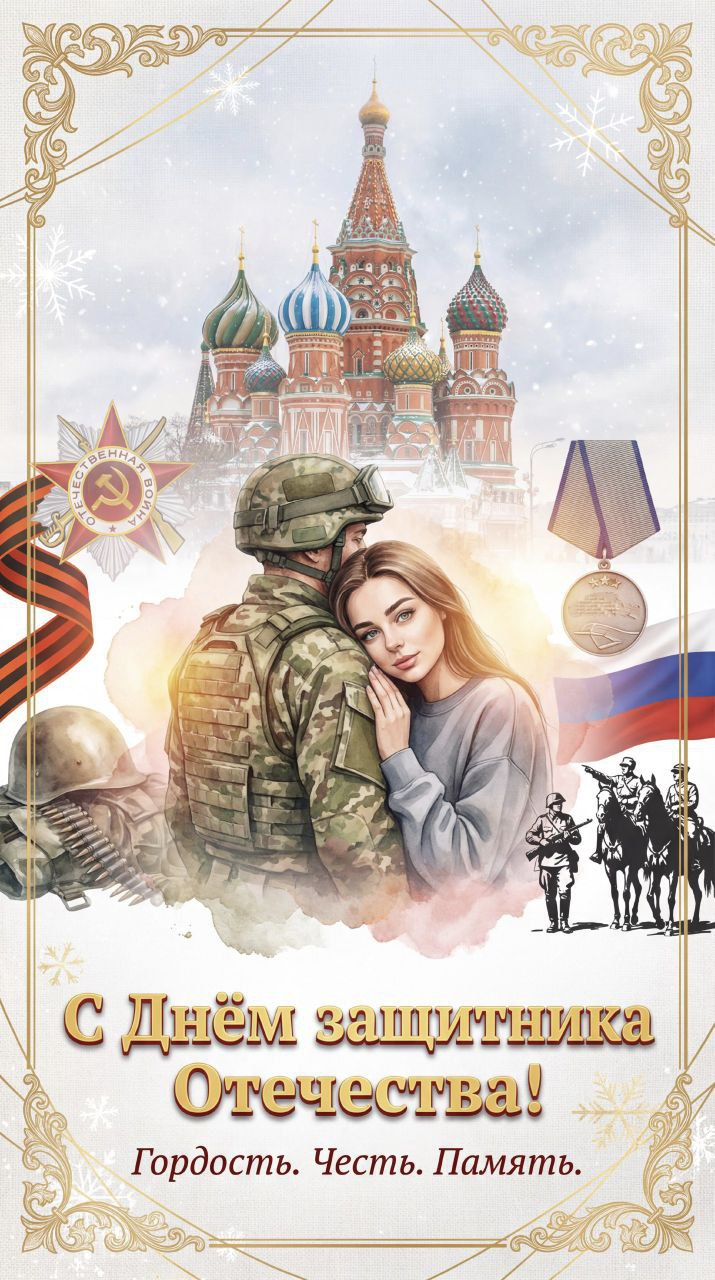 Промпт для создания баннера в стиле открытки «С Днём защитника Отечества» Создай патриотичный баннер-открытку ко Дню защитника Отечества с использованием моих фотографий. Баннер должен сочетать торжественность, теплоту и семейную тематику, как на примере. Структура баннера: 1. Верхняя часть (фон): - изображение знакового места России (например, Собор Василия Блаженного на фоне зимнего пейзажа) — полупрозрачное, служит фоном; - лёгкая декоративная рамка по краям (золотистая, с элементами орнамента). 2. Центральная часть (основной акцент): - слева: фото военнослужащего в камуфляже и шлеме (угол съёмки — со спины, как на примере) [сюда вставить моё фото]; - справа: фото женщины (портретный снимок, взгляд в камеру, поза расслабленная, голова опирается на плечо военнослужащего) [сюда вставить моё фото]; - между фигурами — плавный переход, создающий ощущение объятия и единства; - добавить лёгкие световые блики и эффект «акварельности» для мягкости образа. 3. Левая сторона (символика): - изображение красного георгиевского банта; - орден Отечественной войны (стилизованный, полупрозрачный); - элементы военной атрибутики (например, патронташ, каска) — в приглушённых тонах. 4. Правая сторона (символика): - медаль «За отвагу» (стилизованная); - флаг России (миниатюрное изображение, полупрозрачное); - силуэты всадников и солдат (как на гербе) — чёрно-белые, минималистичные. 5. Нижняя часть (текстовый блок): - крупная надпись: «С Днём защитника Отечества!» [шрифт: торжественный, с засечками, цвет — золотой с красной тенью]; - под основной надписью (мелким шрифтом, курсивом): «Гордость. Честь. Память.» [цвет — тёмно-красный]. Визуальные детали: - Цветовая гамма: сочетание красного, золотого, зелёного (камуфляж) и белого (снег, фон); - Текстуры: лёгкий эффект «холста» на фоне, матовая отделка у элементов символики; - Тени и объём: добавить мягкие тени под фигурами и текстовым блоком для глубины; - Декоративные элементы: снежинки в углах, тонкие золотые линии, разделяющие зоны баннера. Технические параметры: - Формат: горизонтальный, соотношение сторон 16:9; - Разрешение: минимум 1920×1080 px; - Выравнивание: элементы сбалансированы, центральный акцент — на фигурах; - Слои: обеспечить возможность замены фотографий и корректировки текста. Цель баннера: выразить уважение и благодарность защитникам Отечества, подчеркнуть семейные ценности и патриотизм. Подходит для публикации в соцсетях, печати или использования как поздравительную открытку.