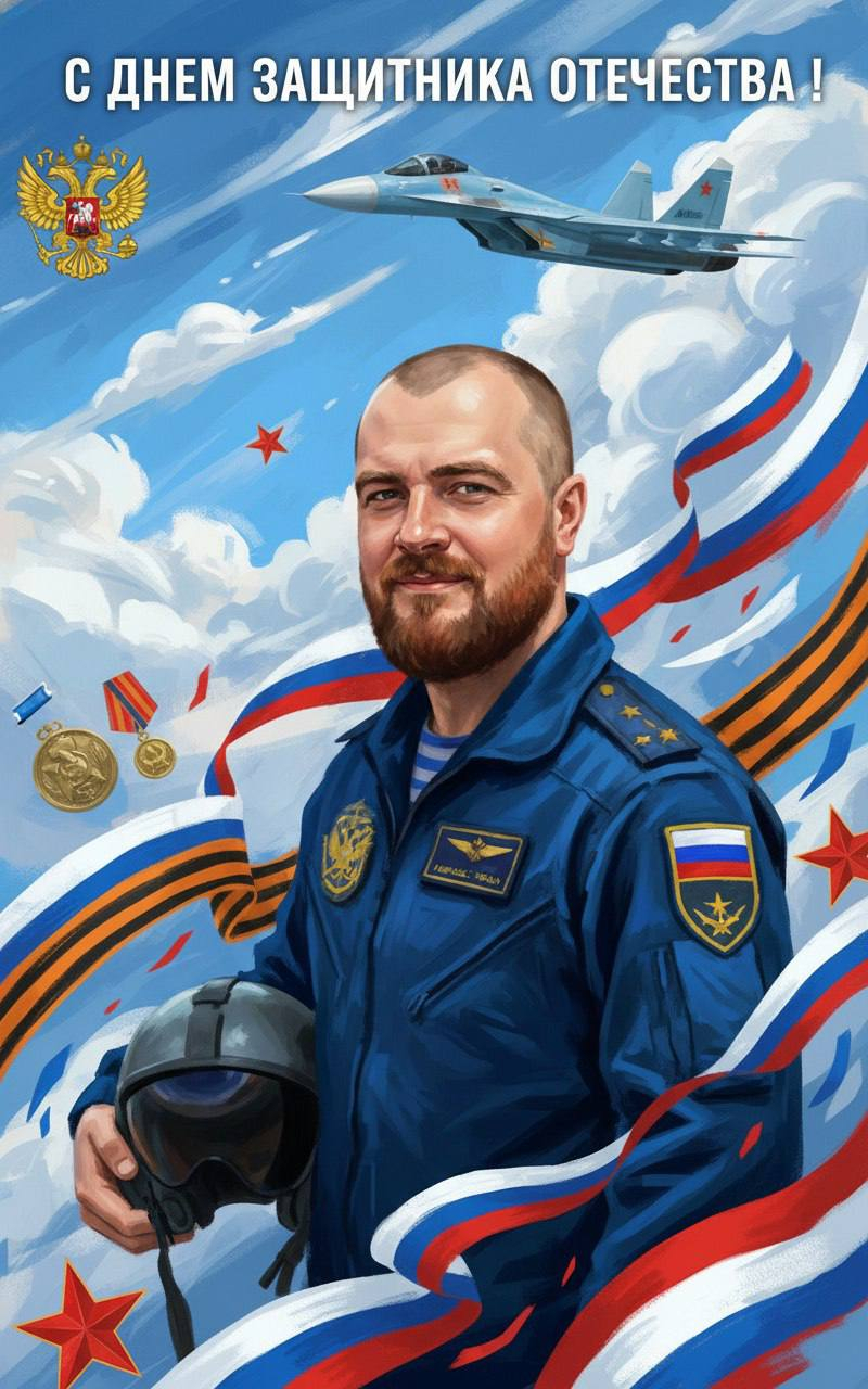 Мужчина-пилот ВКС России, летная куртка с шевроном триколора, шлем рядом, истребитель Су-35 или Су-57 в небе, герб РФ и красные звёзды в композиции, Георгиевская лента, орденская символика, единый художественный фон в цветах российского триколора, праздничная открытка к 23 февраля, цифровая живопись, живописные мазки, насыщенные голубые, белые и красные оттенки, ракурс 3/4, динамичная композиция, надпись "С Д Н Е М З А Щ И Т Н И К А О Т Е Ч Е С Т В А !" сверху