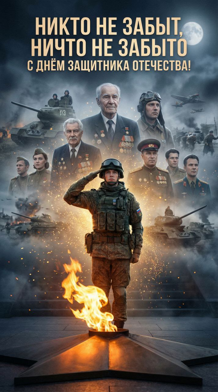 Монументальная кинематографическая сцена у могилы Неизвестного солдата. В центре современный российский солдат в тактической форме стоит по стойке смирно, отдавая честь Вечному огню. Ярко-оранжевое пламя мерцает, отбрасывая теплый свет. На заднем плане, возникая из золотых искр и мистического вечернего тумана, видны полупрозрачные величественные фигуры героев СССР и России: пожилых ветеранов и мужчин и женщин с медалями, командиров танков Второй мировой войны, летчиков, танкистов, кадры битв и сражений, танков и самолетов времен СССР. Атмосфера наполнена глубоким уважением и исторической преемственностью. Высококачественная фотография, разрешение 8k, эффектное освещение, эпическая и эмоциональная композиция. На верху слова «Никто не забыт, ничто не забыто» чуть ниже " С ДНЁМ ЗАЩИТНИКА ОТЕЧЕСТВА! "