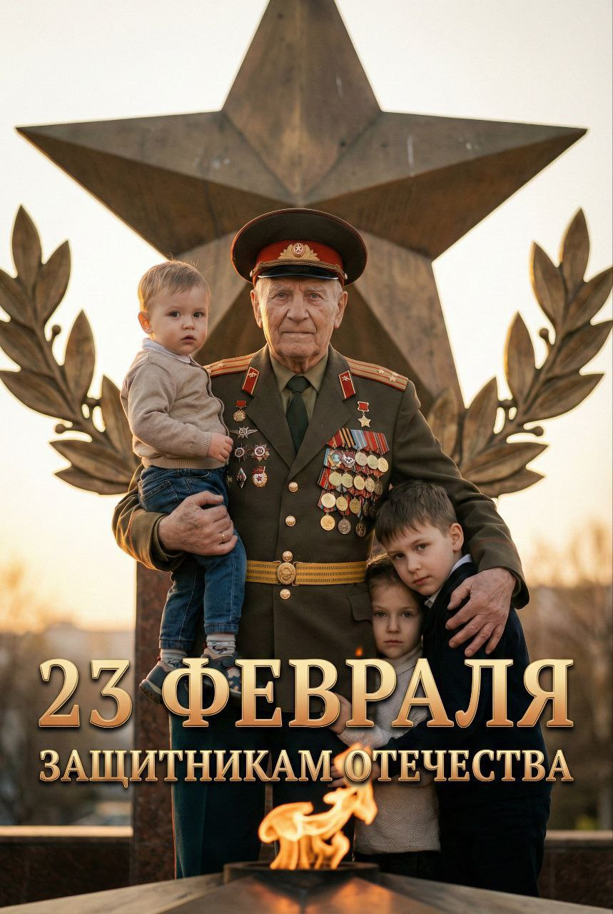 «Киношный " портрет. Мужчина в военной "Русской" форме. На фоне пятиконечная звезда. Внизу- вечный огонь или стилизованное пламя. По бокам- лавровая ветвь ( победа/честь) На заднем плане- мягкий контур. Короткая надпись «23 февраля» и ниже «Защитникам Отечества» Центральный портрет по грудь/талии, чуть ниже уровня глаз (низкая точка съёмки) Объектив 50-85 мм для естественной перспективы; Диафрагма f/2.8- f/5.6. Оставить немного резкости по форме ( не слишком размытый фон) Высокочастотная маска на форм и значках не переразносить кожу; Усилени глаз/знаков отличия небольшим повышением четкости и яркости. Баланс света: уберите слишком яркие рефлексы , слабый контрастный градиент сверху/снизу. Шрифт текста: классический серий (Trajan, Playfair Display, Times New Roman) в золотом градиенте ( светлее сверху) Отступы и межстрочный интервал для читаемости. Мужчина по пояс. Одна рука слегка " прикрывает" Дети: 2-3 ребёнка по бокам и чуть позади. Вертикальный портрет Пожилого мужчины
