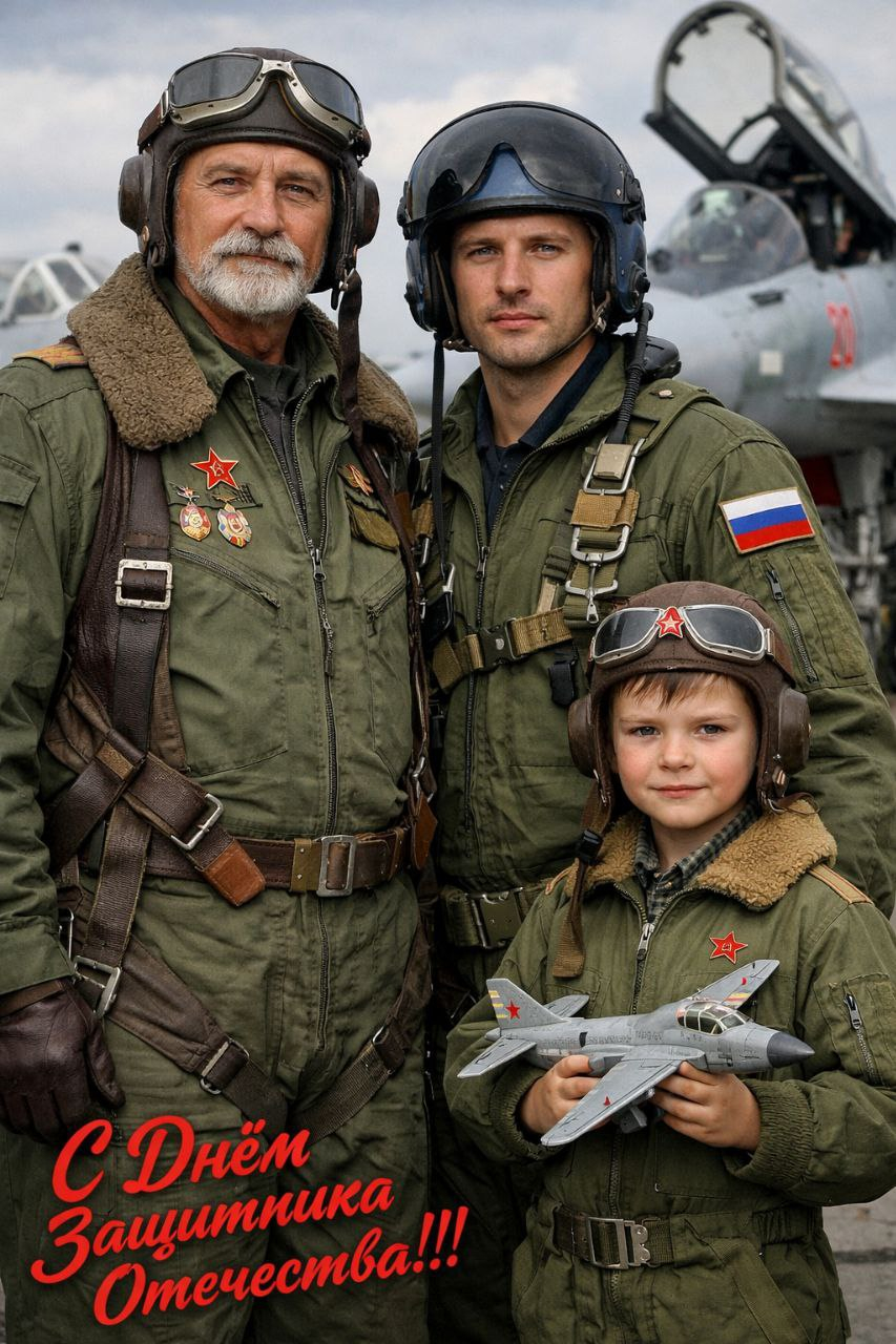 Создай реалистичных людей в военной форме пилотов самолёта. 1 мужчина. Рост 185, ухоженная борода, Усы. Возраст 65 лет 2 мужчина средних лет, примерно 35-37 лет. Рост 180 см. 3 мальчик, возраст 7 лет, Они должны быть внешне похожи. Одежда военных лётчиков, разных годов, Советская, СССР, России. Взгляды серьезные, мужественные. Они стоят на фоне Российских самолётов. У мальчика в руках игрушечный самолёт. В левом нижнем углу написаны красивым крупным шрифтом, красного цвета, слова " С Днëм Защитника Отечества!!! Качество 8к, ультрареалистичное фото, прорисованные детали одежды.