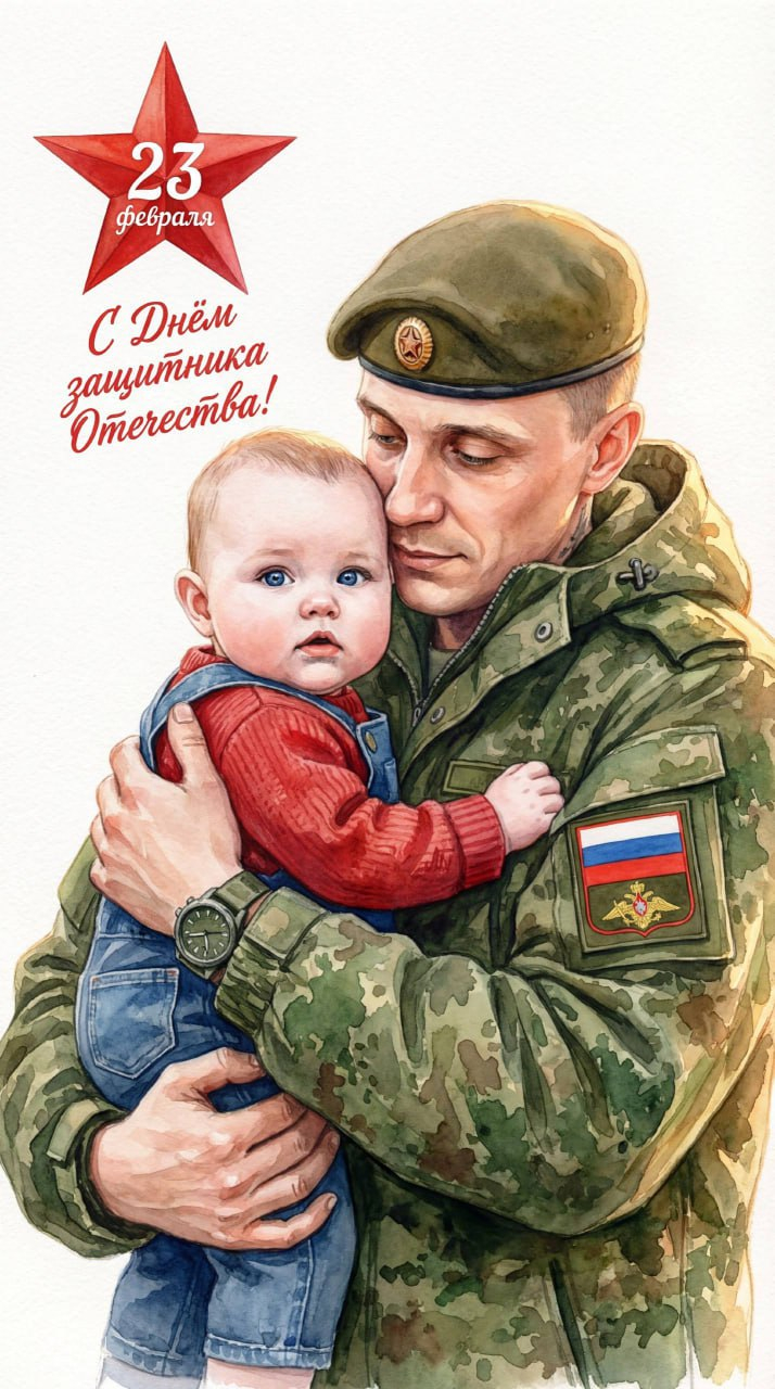 Не изменяй черты лица «Тёплая, трогательная сцена: взрослый мужчина в военной форме сидит, крепко прижимая ребёнка к груди. Позы: мужчина слегка согнут вперёд, обнимает ребёнка двумя руками — одна рука обхватывает спину, другая поддерживает ножки; ребёнок прижимается щекой к груди, одна ручка обвивает плечо. Ракурс и кадрирование: крупный план по пояс — от середины бёдер вверх, ракурс чуть сверху и в три четверти (slightly elevated three-quarter view), плотная, интимная композиция, фигуры смещены в центр-низ кадра. Свет: мягкое рассеянное дневное освещение с тёплым рим-лайтом по краю плеч и головы, лёгкие мягкие тени для объёма, высокоключевой светлый фон — почти белый, без деталей. Стиль и эффекты: реалистично-иллюстративная живописная обработка (живопись/акварель с тонкой текстурой кисти), мягкая зернистость и лёгкий виньет для фокусировки на героях, насыщенные, но приглушённые цвета, подчёркнутые текстуры ткани и кожи. Одежда и детали: мужчина в зелёной камуфляжной куртке-парке с капюшоном и фуражкой/беретом оливкового цвета (на рукаве видна нашивка с флагом России), аккуратный военный ремень и тактический карман на груди; на запястье видны часы. Ребёнок в джинсовом комбинезоне поверх красного трикотажного свитера, Надпись и графика: в верхней части изображения крупная красная пятиконечная звезда с цифрами «23» и словом «февраля» внутри, под ней крупная рукописная красная надпись «С Днём защитника Отечества!» — каллиграфический курсив с динамичным наклоном, контрастный насыщенный красный цвет для праздничного акцента. Цветовая палитра: оливково‑зеленые и камуфляжные тона, тёплые кожаные оттенки, нейтрально‑серый для одежды ребёнка, яркий красный для текста и символа. Атмосфера: трогательная, защитная, праздничная, эмоционально тёплая.»