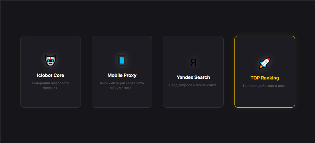 Профессиональный сервис накрутки поведенческих факторов работает на принципиально иной архитектуре. Рассмотрим это на примере технологии Iclobot: