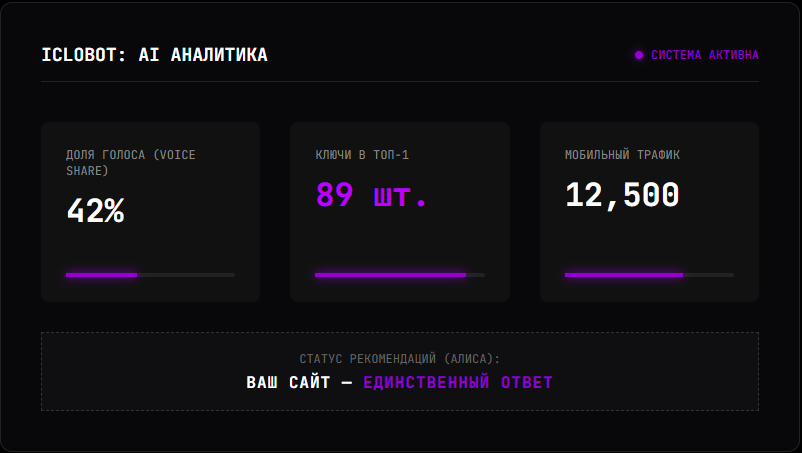 Голосовой поиск - это «Игра престолов» 2026 года. Победитель получает всё, проигравший - ничего. У вас есть выбор: оставаться невидимкой для миллионов пользователей Алисы или стать брендом №1, который рекомендует сам Яндекс.