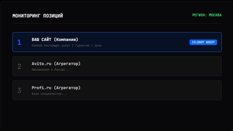 В этой статье мы разберем стратегию «Давид против Голиафа»: как использовать сервис накрутки ПФ iclobot.ru, чтобы вернуть себе законное место в ТОП-1 и перестать платить за лиды агрегаторам.