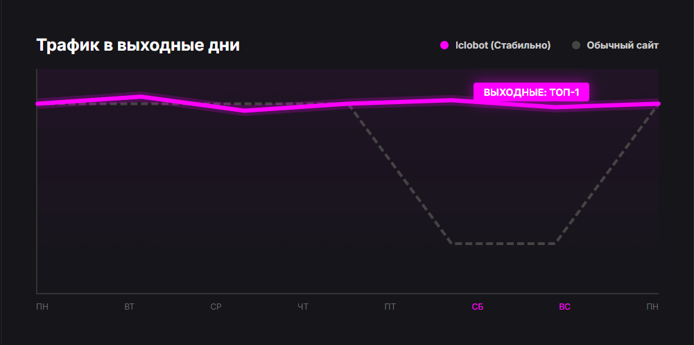 Многие замечали: в будни сайт в топе, а в субботу позиции проседают. Причина в естественном снижении бизнес-трафика. В B2B секторе в выходные активность падает до нуля. Яндекс видит это падение и может временно понизить сайт в выдаче, отдав предпочтение развлекательным ресурсам или агрегаторам.