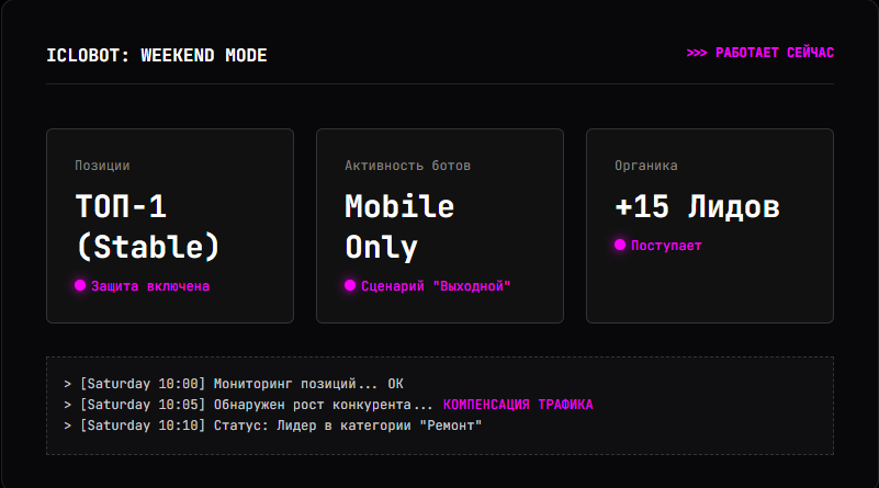 Если вы останавливаете маркетинговую активность в пятницу вечером, вы добровольно отдаете 30% недельной выручки конкурентам, чьи роботы продолжают работать. Накрутка поведенческих факторов — это идеальный сотрудник. Он не просит отгул, не требует двойной оплаты за выход в праздники и гарантирует результат.