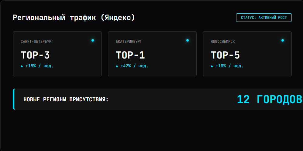 Выберите 3 пилотных города с разной конкуренцией (например, Нижний Новгород, Казань, Ростов-на-Дону). Не пытайтесь охватить всю Россию сразу. Настройте на них небольшие потоки трафика.