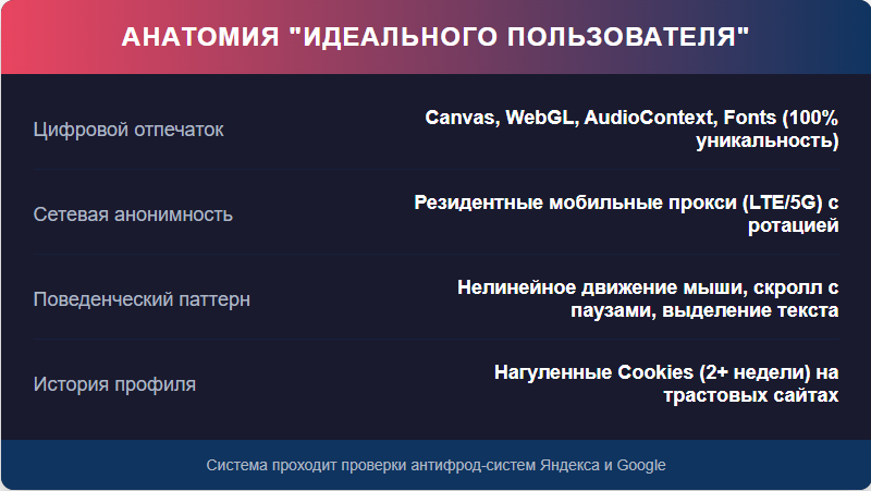 Поисковая система (например, Яндекс) анализирует пользователя по сотням параметров. Это не только IP-адрес. Это разрешение экрана, шрифты, установленные в системе, версия драйверов видеокарты (WebGL), уровень заряда батареи (на мобильных устройствах) и даже скорость движения курсора.