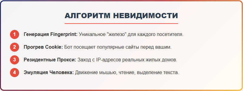 Вся суть в резидентных прокси и уникализации. Когда бот заходит на сайт, он делает это не с IP-адреса дата-центра (который сразу палится), а с IP-адреса реального домашнего Wi-Fi или мобильной сети обычного пользователя (например, из соседнего подъезда).