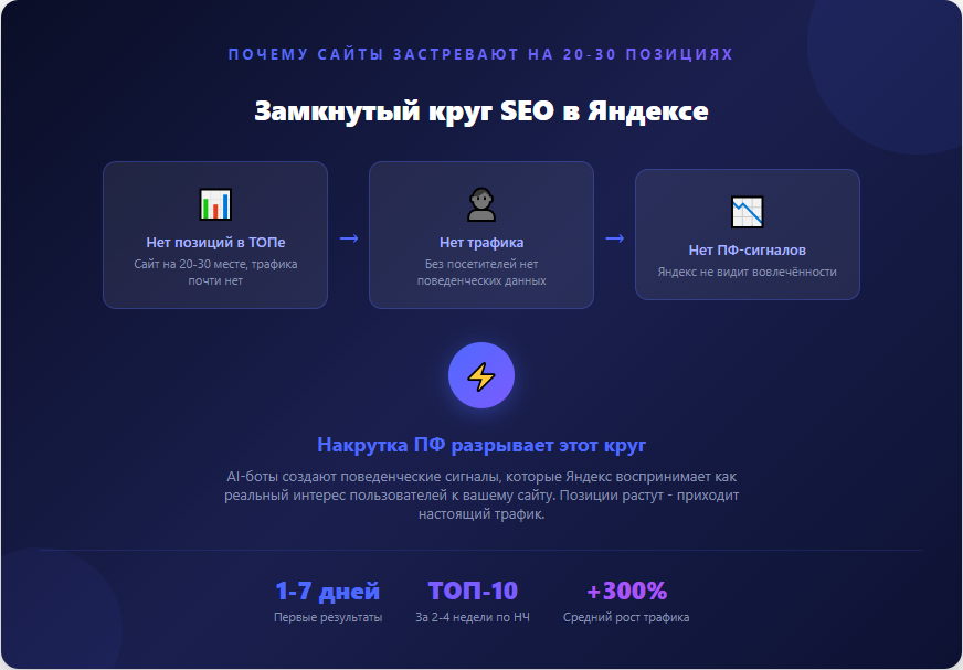 Именно эту проблему решает накрутка поведенческих факторов. По сути, это искусственное создание тех самых сигналов, которые говорят Яндексу: «Этот сайт нравится пользователям, его нужно поднять».