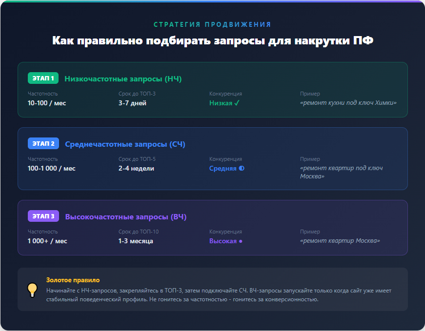 Золотое правило: начинайте с НЧ-запросов, закрепляйтесь в ТОП-3, затем масштабируйтесь на СЧ. ВЧ подключаете, когда сайт уже имеет хорошую базу трафика и поведенческую историю.